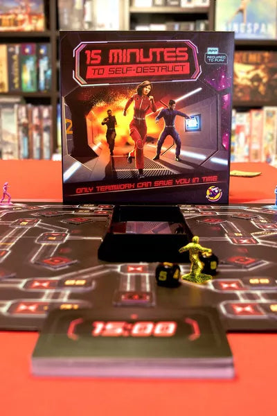 15 Minutes to Self-Destruct is a co-operative game of escaping a spaceship that is about to explode. Preferably before it explodes. The problem is, the self destruction sequence has been set by the ship's AI running wild, and that same AI is still trying to stop the players from fleeing. To successfully flee, the players have to activate the escape pod by turning on 13 switches all over the ship. To reach the switches they have to unlock the doors that block the way between them.