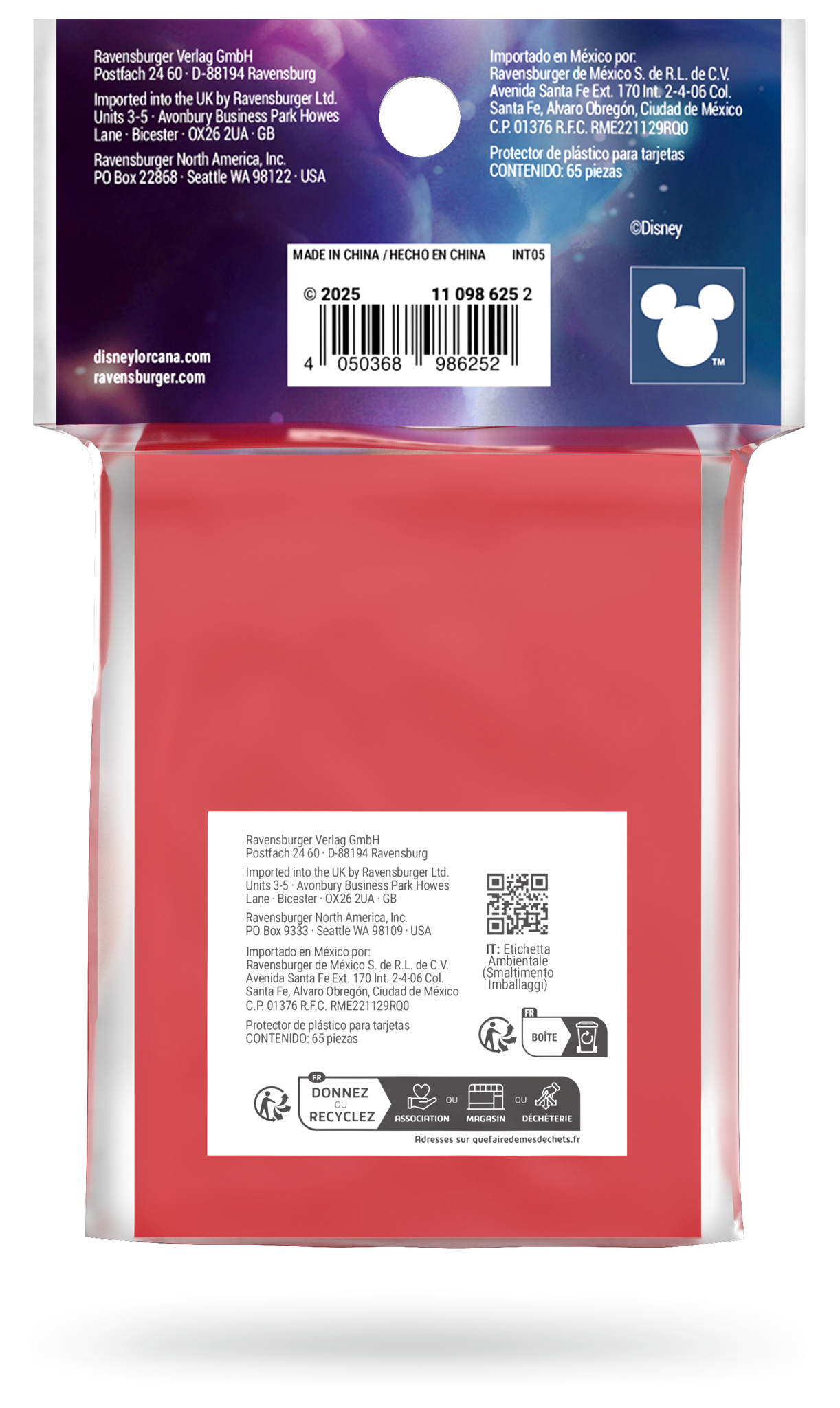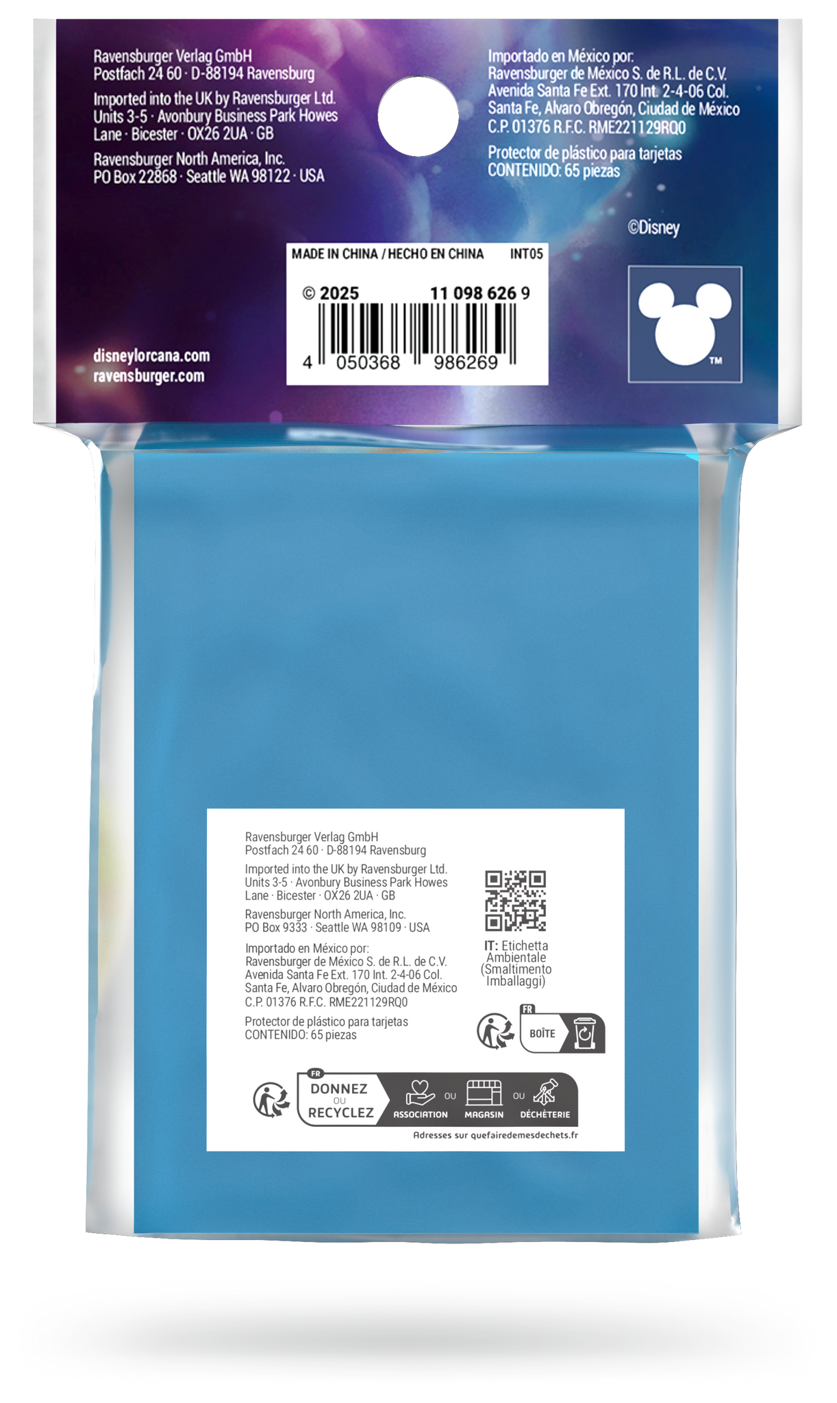 Protect cards from wear and tear during play with card sleeves featuring card art for Disney’s Mulan, and Disney’s Goof Troop. Each pack includes 65 matte-finish card sleeves.