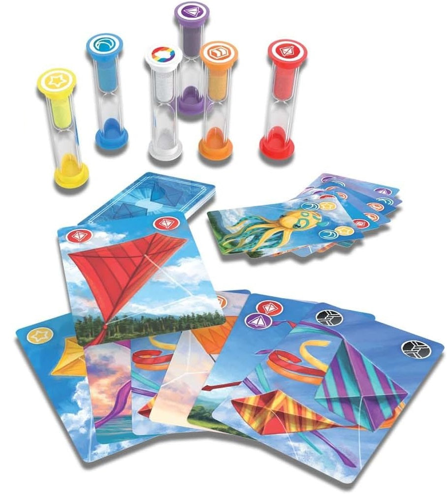 In Kites, everyone works together to keep all their kites — represented by colorful sand timers — in the air. Take turns playing cards, flipping the sand timers, and coordinating with other players to ensure none of the timers run out. If it does, a kite has crashed! Add complication cards for additional challenges.