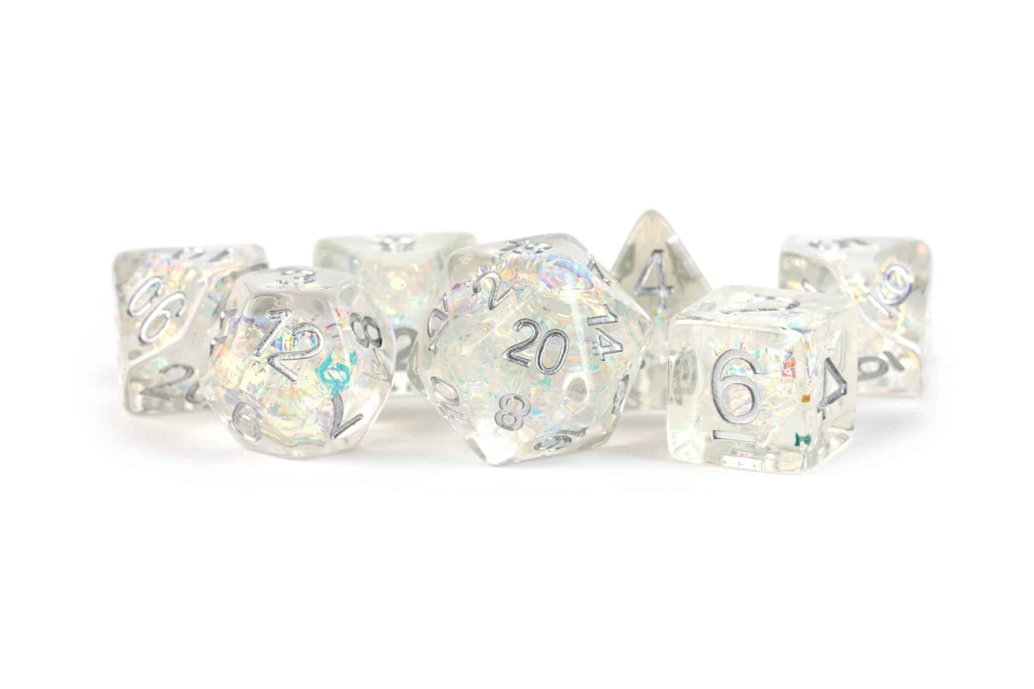 16mm Resin Polyhedral dice sets include 7 Dice, include:• 4-sided (d4)• 6-sided w/numbers (d6)• 8-sided (d8)• 10-sided (d10 numbered 0-9)• Tens 10 (10-sided die numbered 00-90)• 12-sided (d12) and 20-sided (d20)