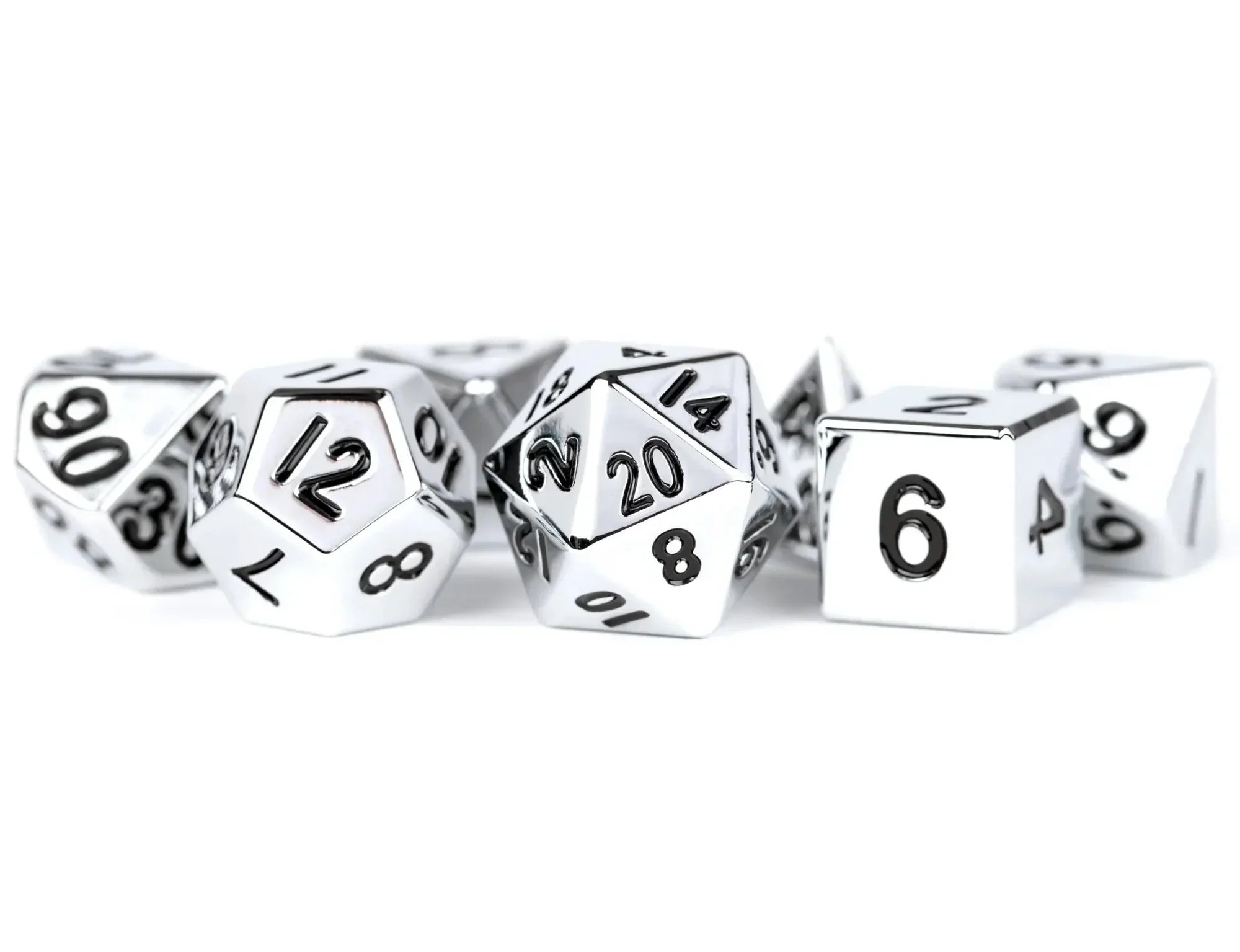 16mm Metal Polyhedral 7 piece dice sets include 7 Dice, include:• 4-sided (d4)• 6-sided w/numbers (d6)• 8-sided (d8)• 10-sided (d10 numbered 0-9)• Tens 10 (10-sided die numbered 00-90)• 12-sided (d12) and 20-sided (d20)