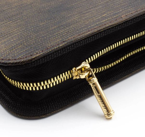 • Unique gold steel scroll zipper head
