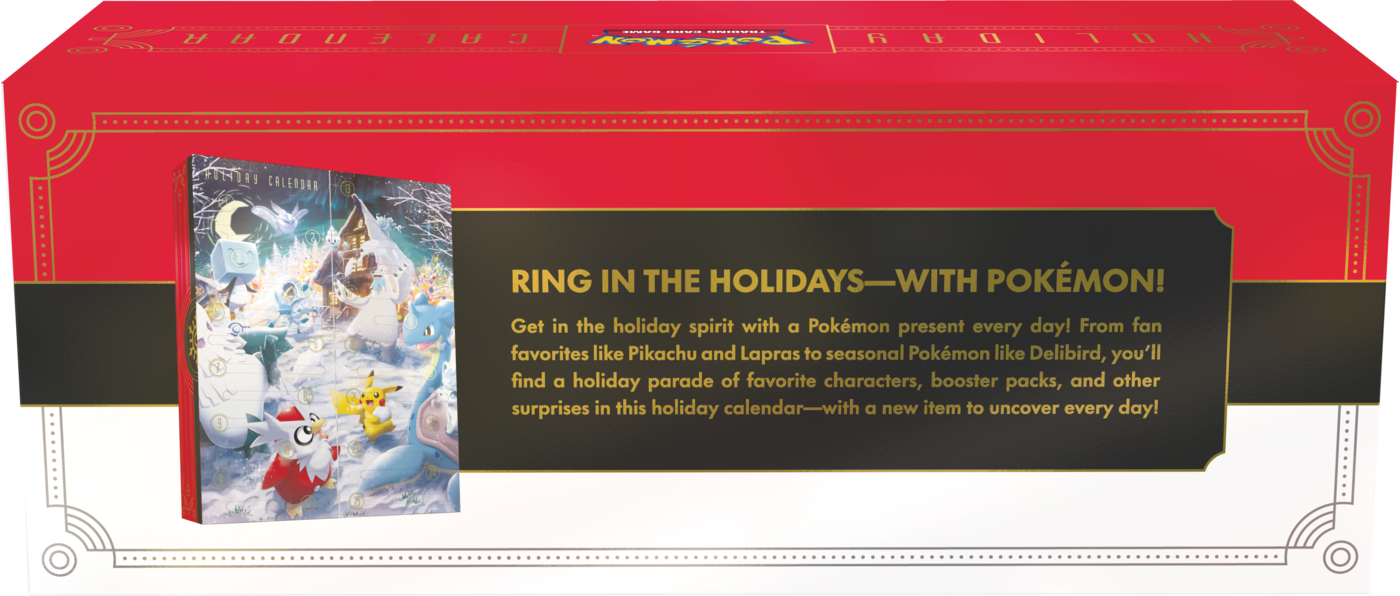 Get in the holiday spirit with a Pokémon present every day! From fan favourites like Pikachu and Lapras to season-celebrating Pokémon like Delibird, you'll find a holiday parade of Pokémon fun, booster packs, and other surprises in this holiday calendar—with a new item to uncover every day!